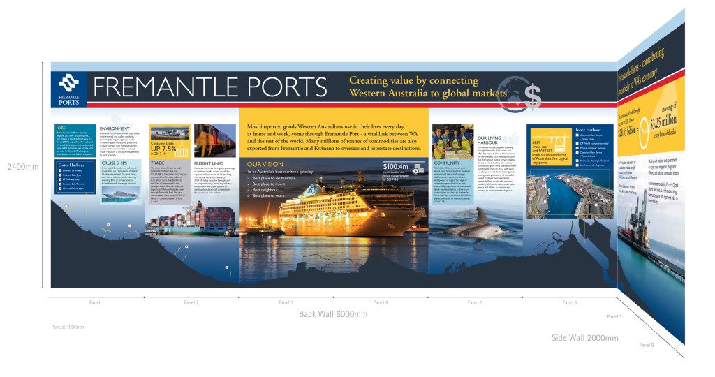 As a contribution to the Annual Maritime Festival which celebrates the Port of Fremantle and attracts 10,000 visitors, I designed a 6.0 x 2.4 m display highlighting some of the key areas and facts of the port’s activities.