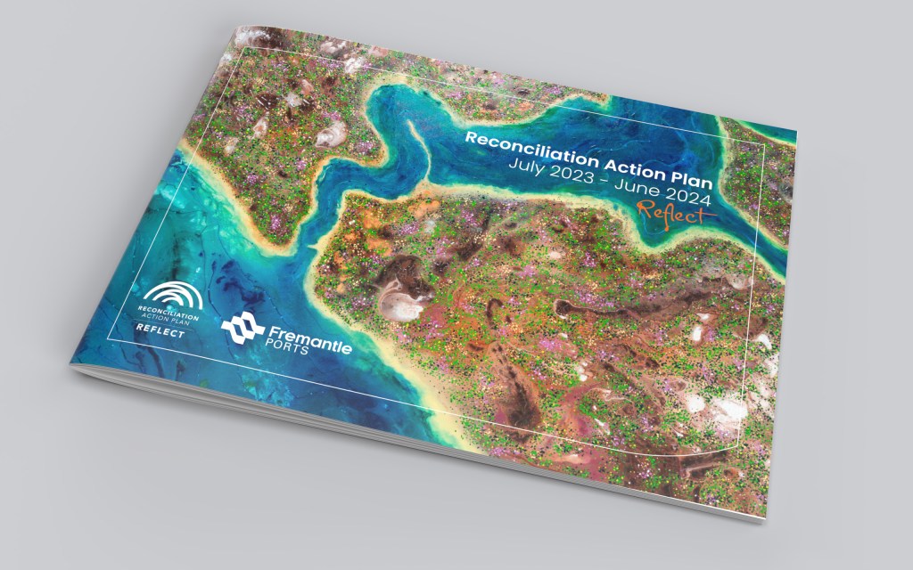 RAPs enable organisations to take meaningful action to advance reconciliation between Aboriginal and Torres Strait Islander Peoples and Non-indigenous Peoples, thus increasing economic equity and supporting First Nations self-determination. I worked alongside Fremantle Ports to commission Noongar artist Bradley Kickett to create appropriate artwork for the front cover and I used Aboriginal-inspired graphics throughout the design.